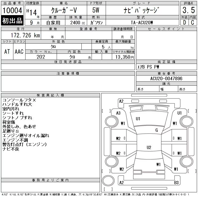 Toyota KLUGER с аукциона Японии CAA Gifu лот № 10004