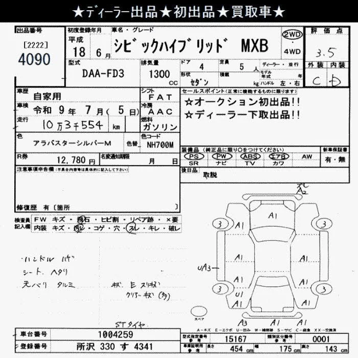 Honda CIVIC HYBRID с аукциона Японии JU Saitama лот № 4090