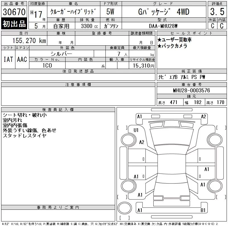 Toyota KLUGER с аукциона Японии CAA Tokyo лот № 30670