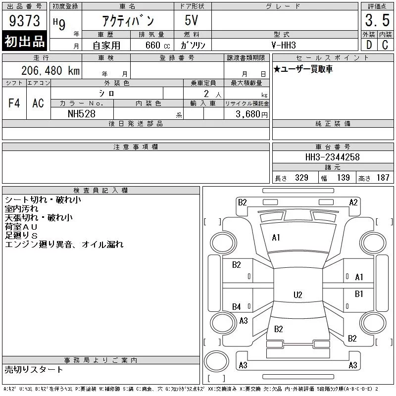 Honda ACTY VAN с аукциона Японии CAA Chubu лот № 9373