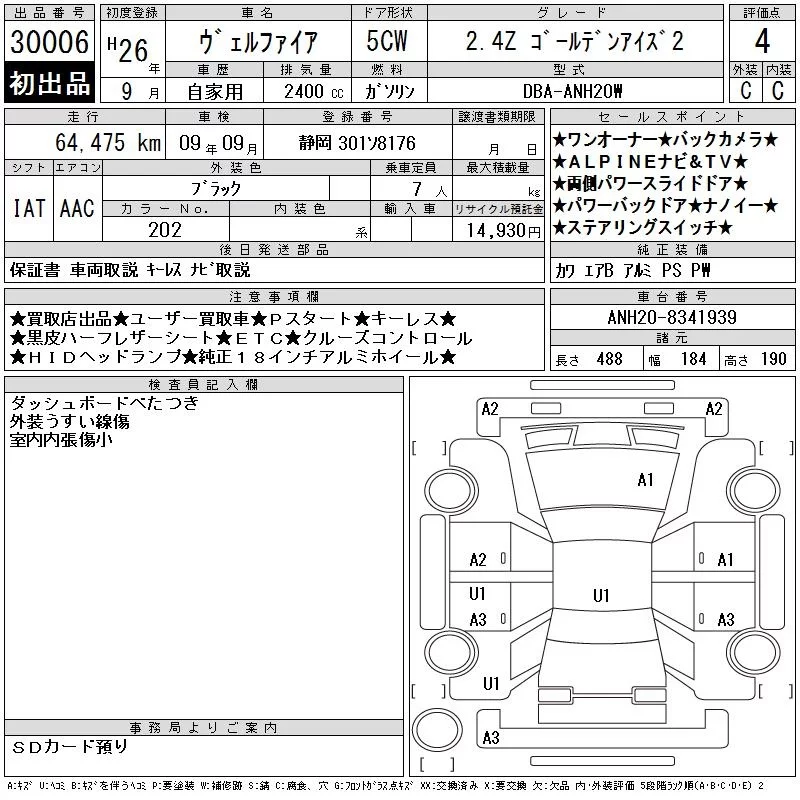 Toyota VELLFIRE с аукциона Японии CAA Chubu лот № 30006
