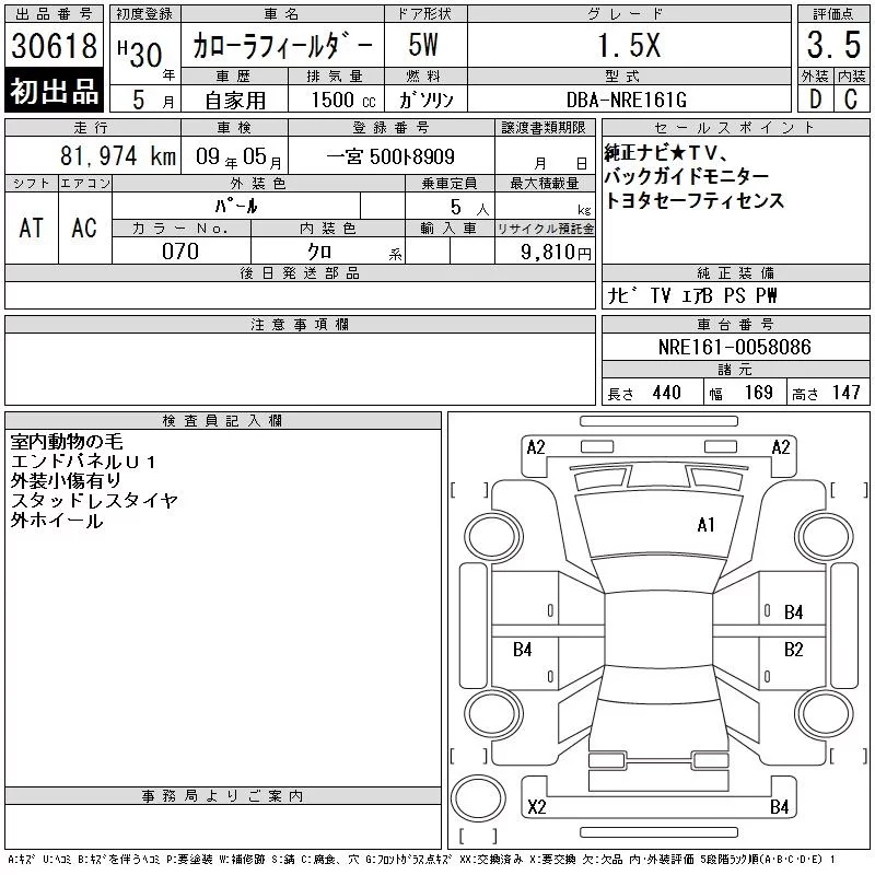 Toyota COROLLA FIELDER с аукциона Японии CAA Chubu лот № 30618
