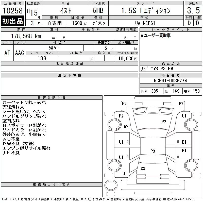 Toyota IST с аукциона Японии CAA Chubu лот № 10258
