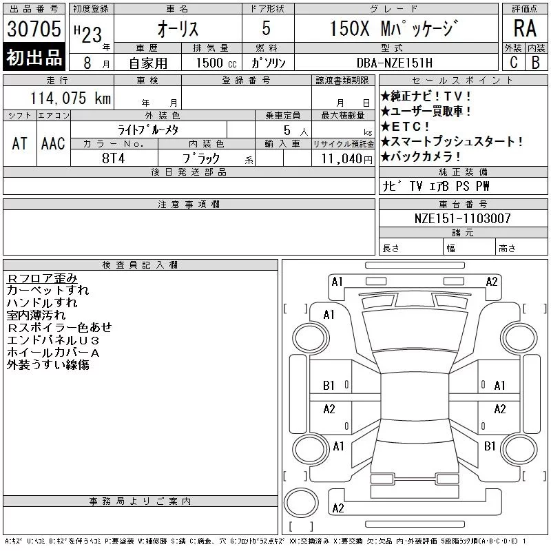 Toyota AURIS с аукциона Японии CAA Chubu лот № 30705