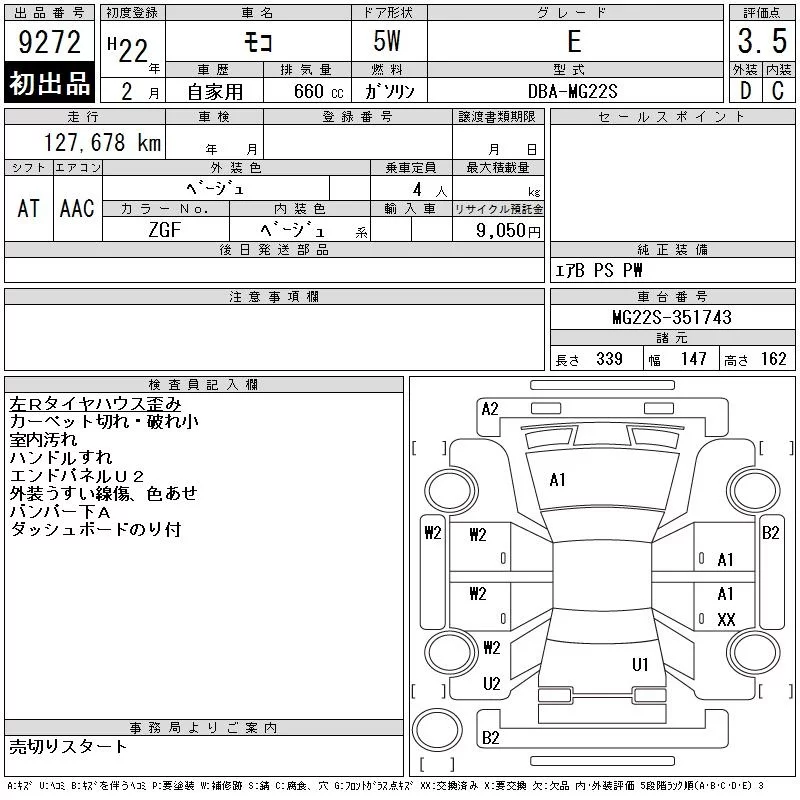 Nissan MOCO с аукциона Японии CAA Chubu лот № 9272