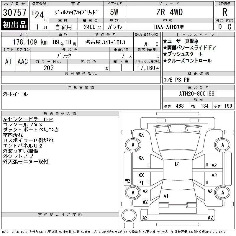 Toyota VELLFIRE с аукциона Японии CAA Chubu лот № 30757