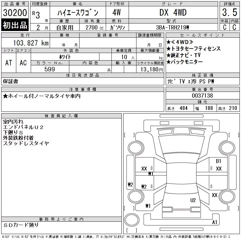 Toyota HIACE с аукциона Японии CAA Chubu лот № 30200