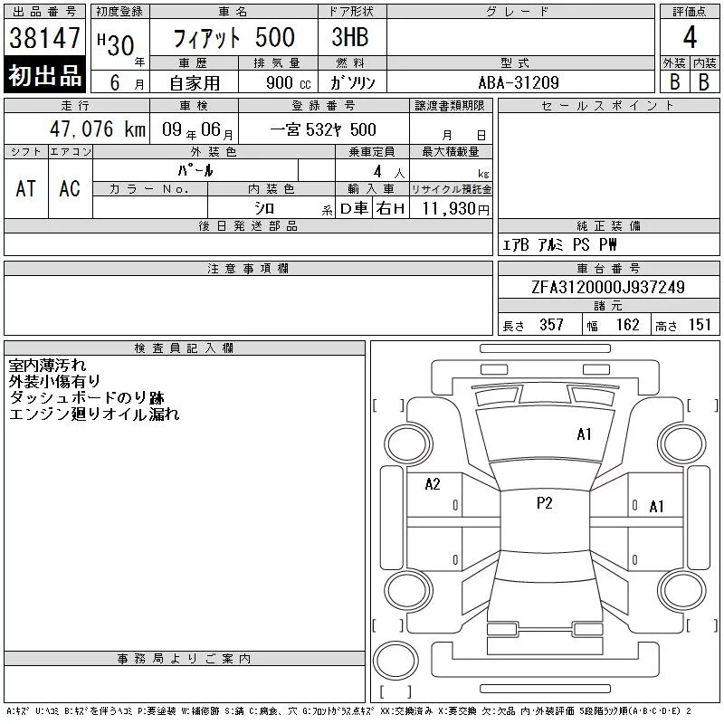 Fiat 500 с аукциона Японии CAA Chubu лот № 38147