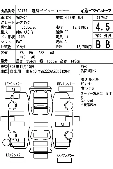 Volkswagen UP с аукциона Японии BAYAUC лот № 60479
