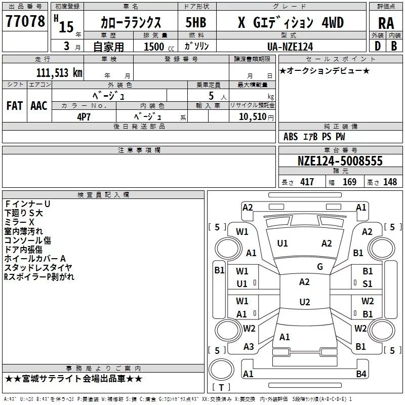 Toyota COROLLA RUNX с аукциона Японии TAA Tohoku лот № 77078