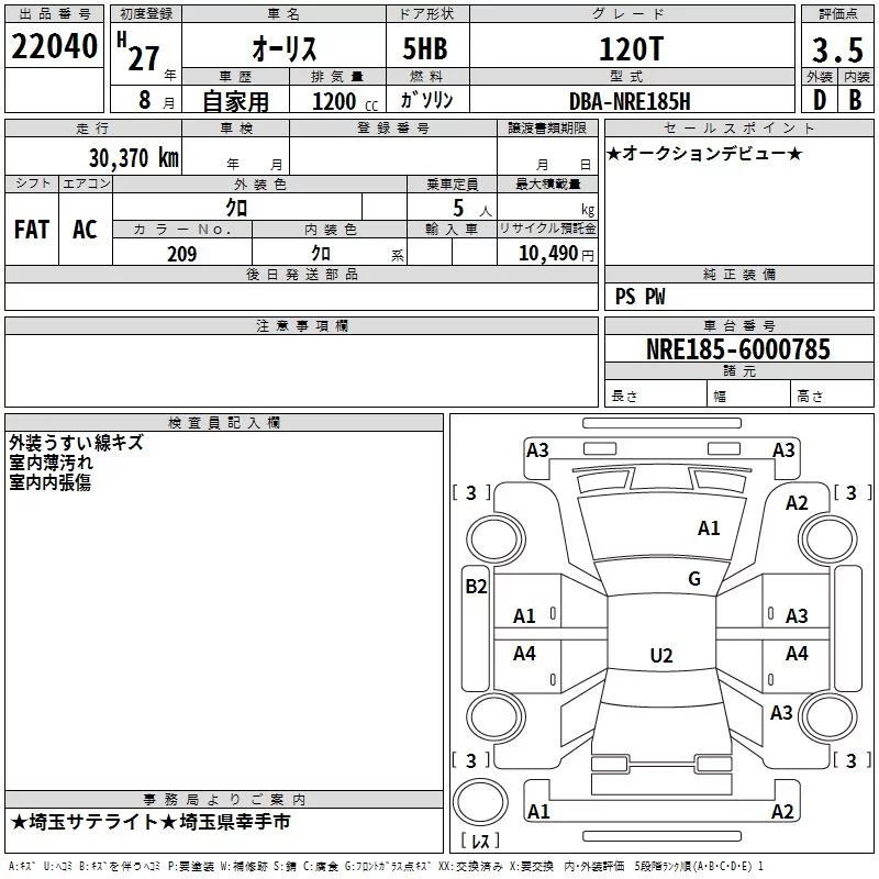 Toyota AURIS с аукциона Японии TAA Kanto лот № 22040