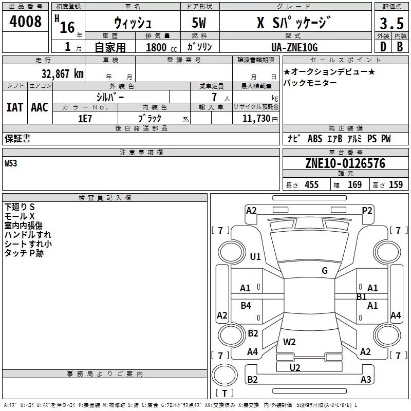 Toyota WISH с аукциона Японии TAA Kanto лот № 4008