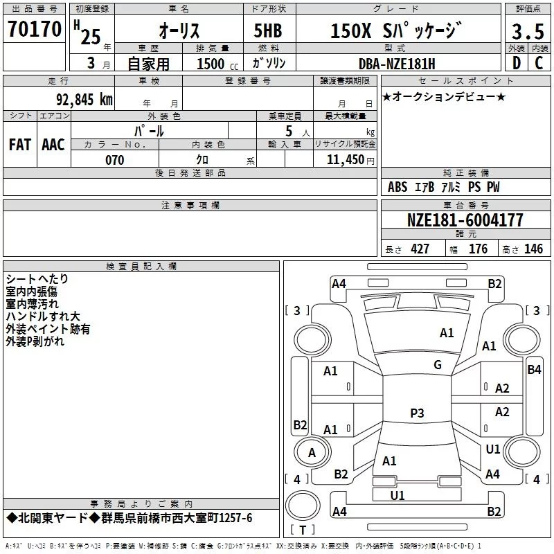 Toyota AURIS с аукциона Японии TAA Kanto лот № 70170