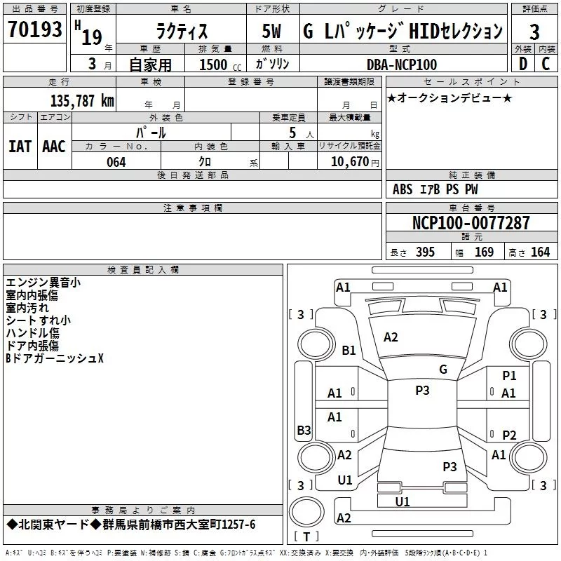 Toyota RACTIS с аукциона Японии TAA Kanto лот № 70193