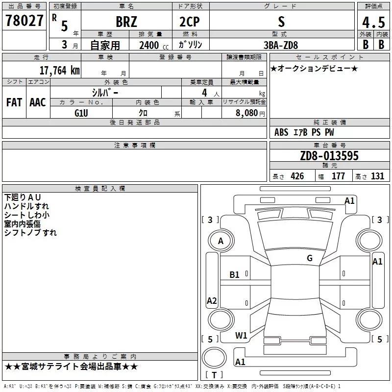 Subaru BRZ с аукциона Японии TAA Tohoku лот № 78027