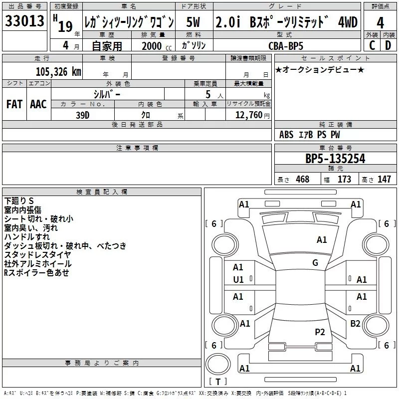 Subaru LEGACY с аукциона Японии TAA Tohoku лот № 33013