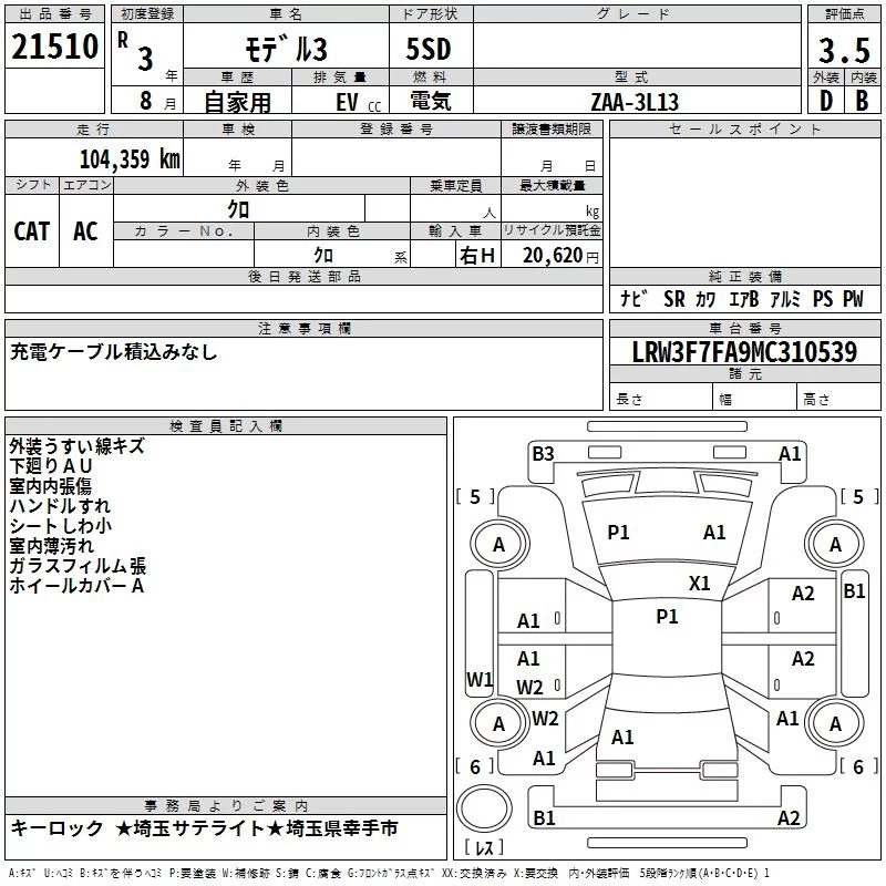 Tesla MODEL3 с аукциона Японии TAA Kanto лот № 21510