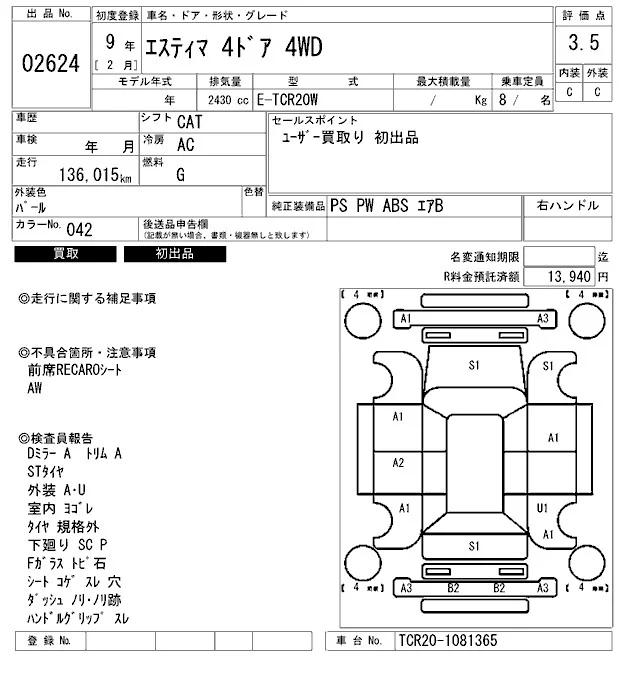 Toyota ESTIMA с аукциона Японии ARAI Bayside лот № 2624