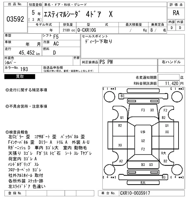 Toyota ESTIMA с аукциона Японии ARAI Bayside лот № 3592