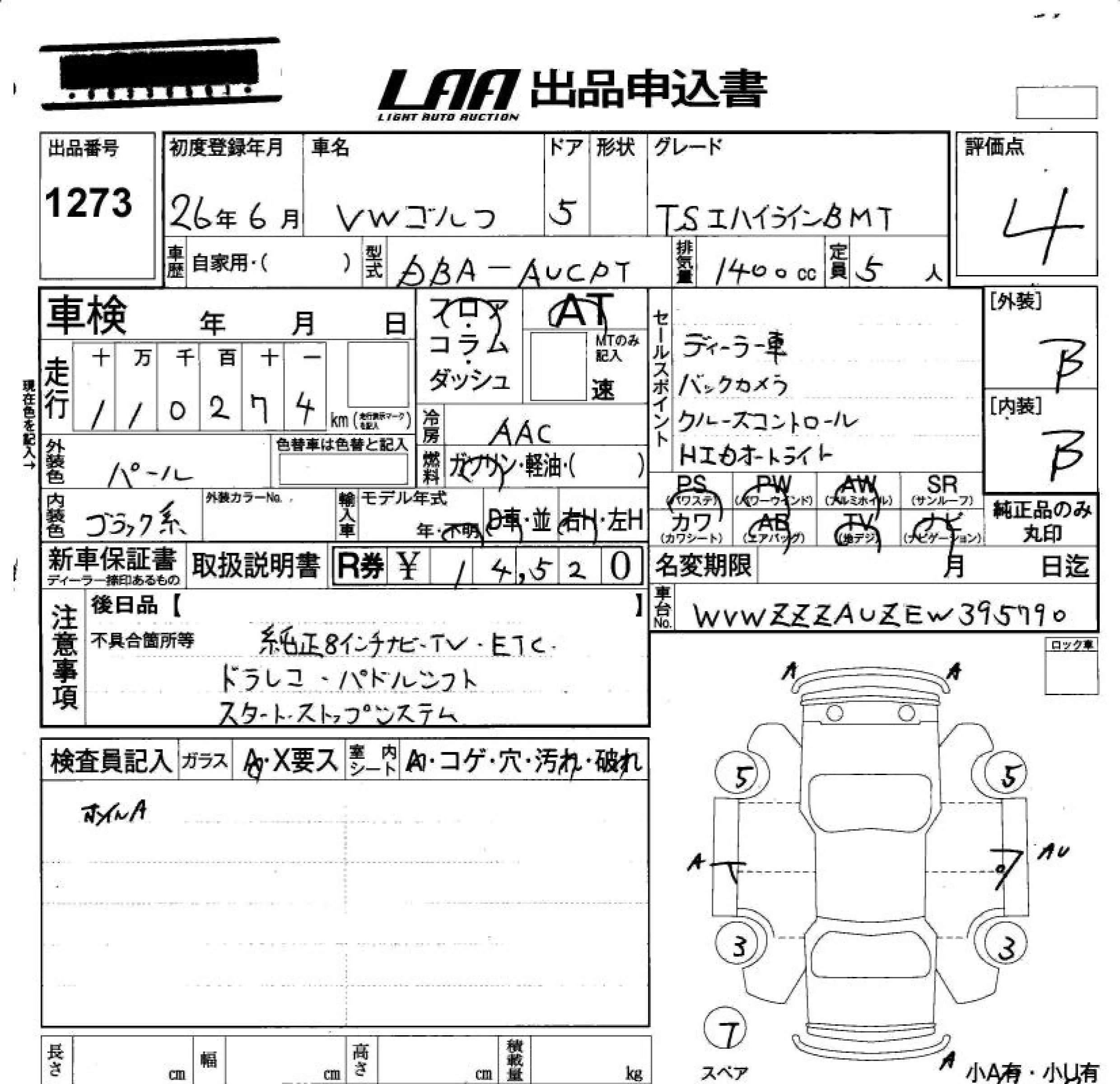 Volkswagen Golf с аукциона Японии LAA Okayama лот № 1273