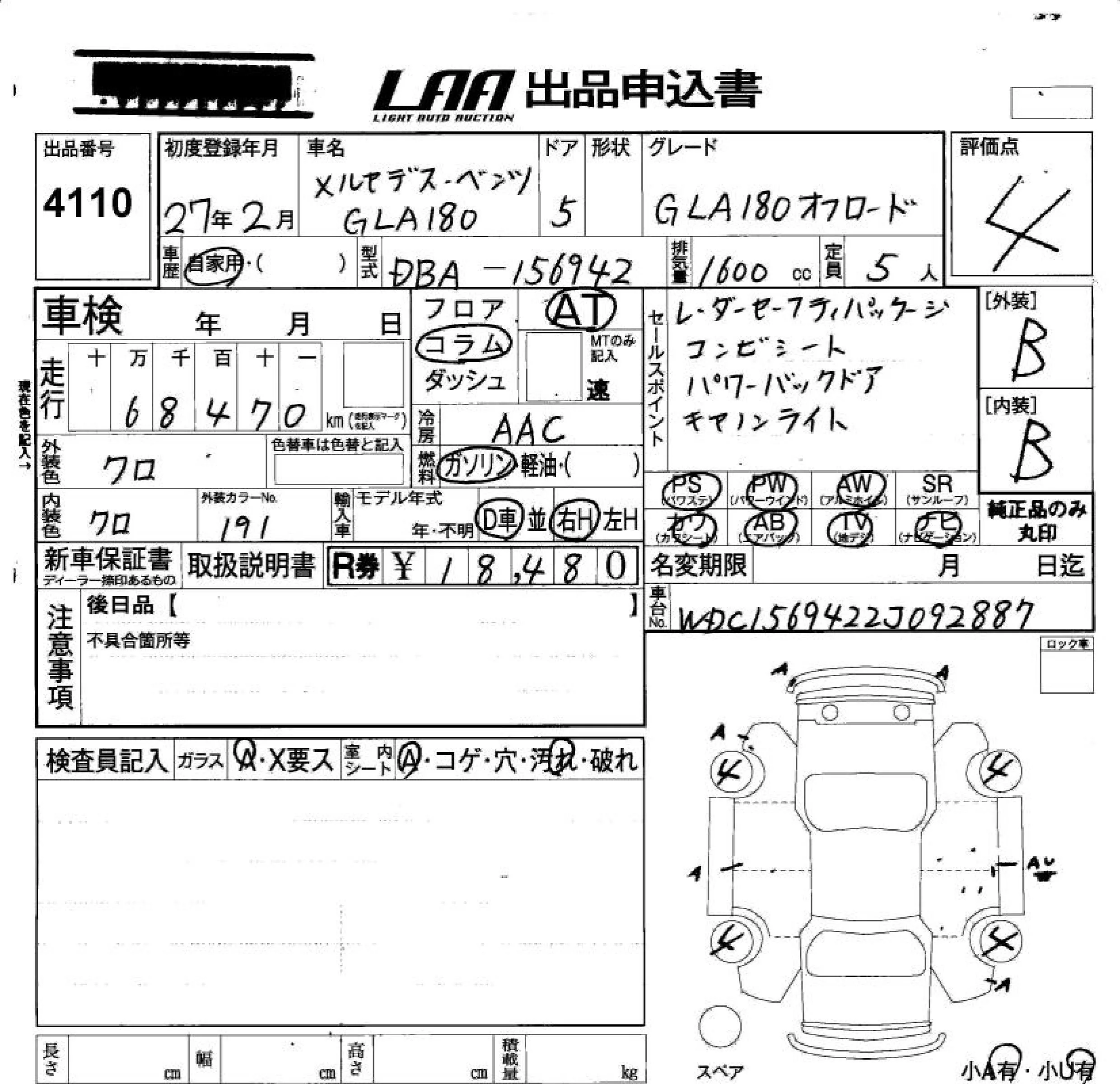 Mercedes-Benz GLA CLASS с аукциона Японии LAA Okayama лот № 4110