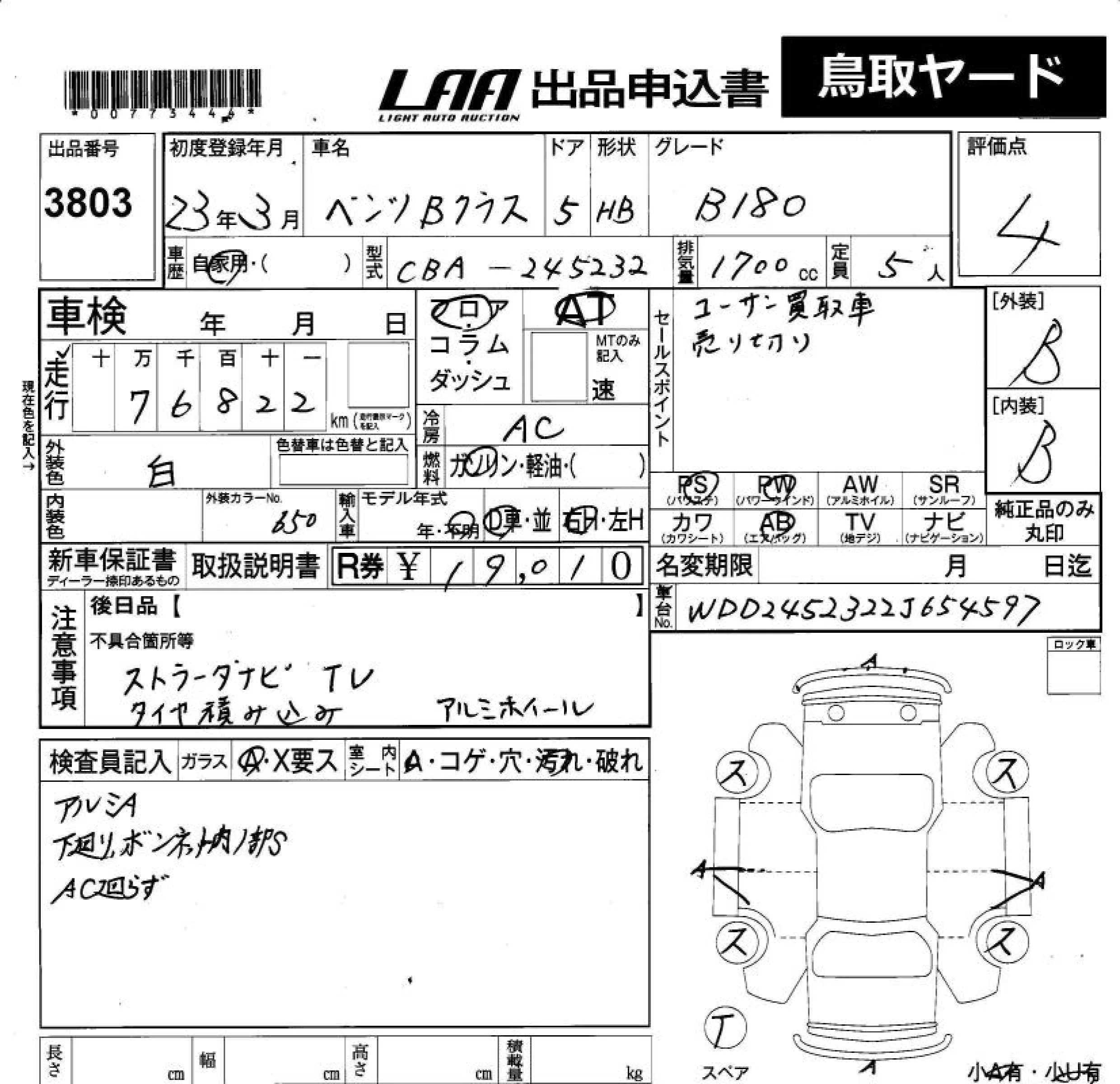 Mercedes-Benz B CLASS с аукциона Японии LAA Okayama лот № 3803