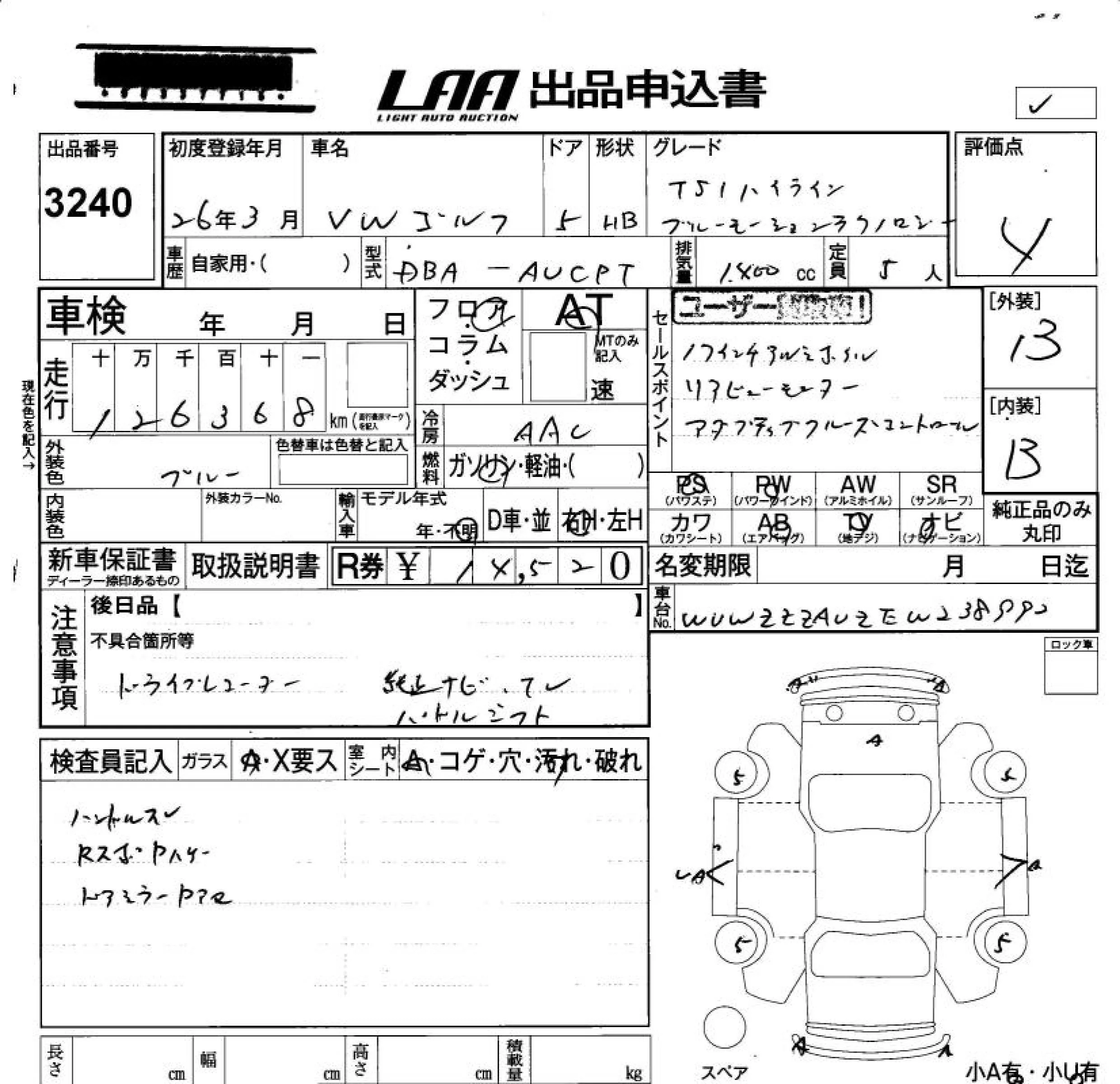 Volkswagen Golf с аукциона Японии LAA Okayama лот № 3240