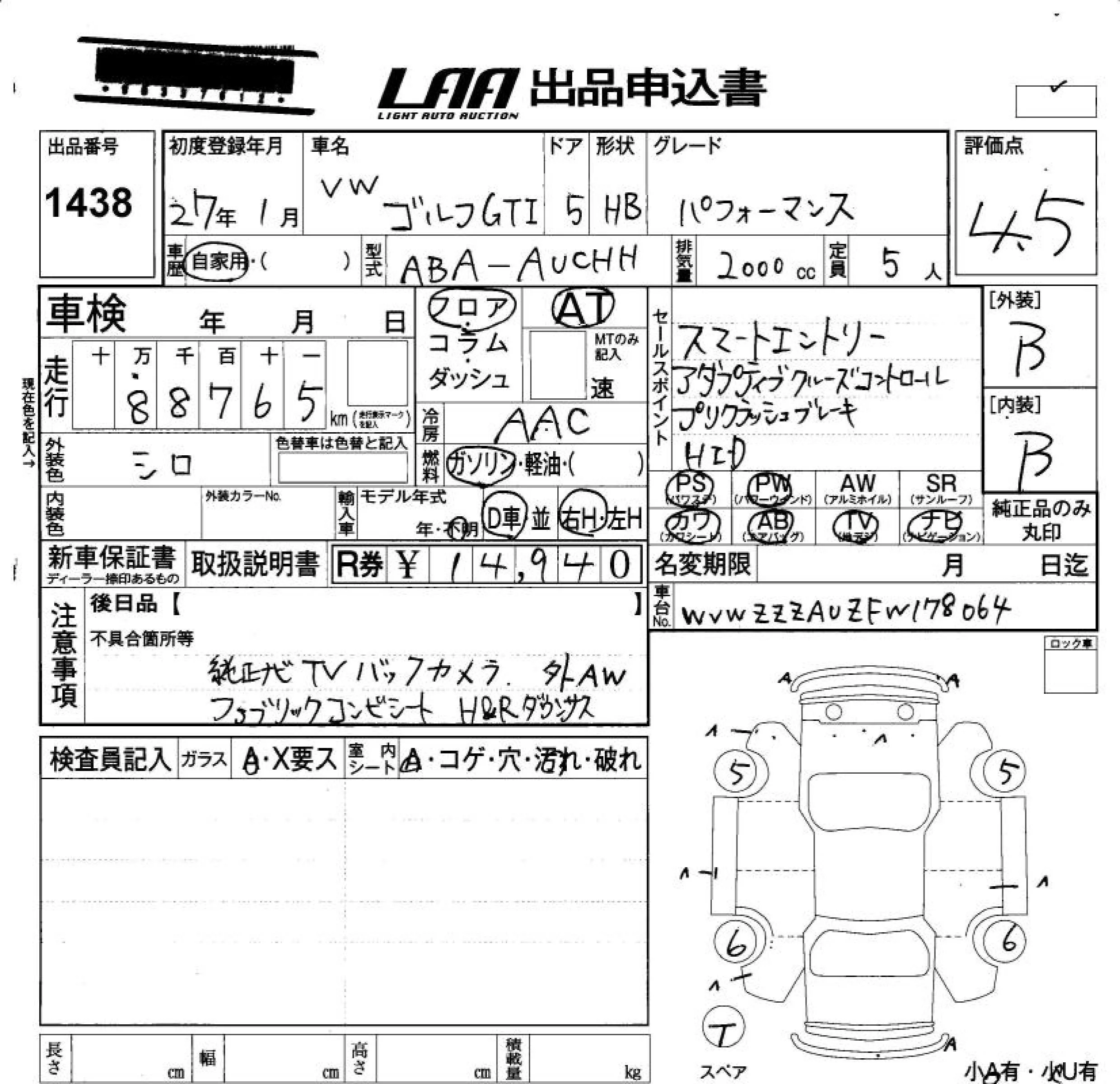 Volkswagen Golf с аукциона Японии LAA Okayama лот № 1438