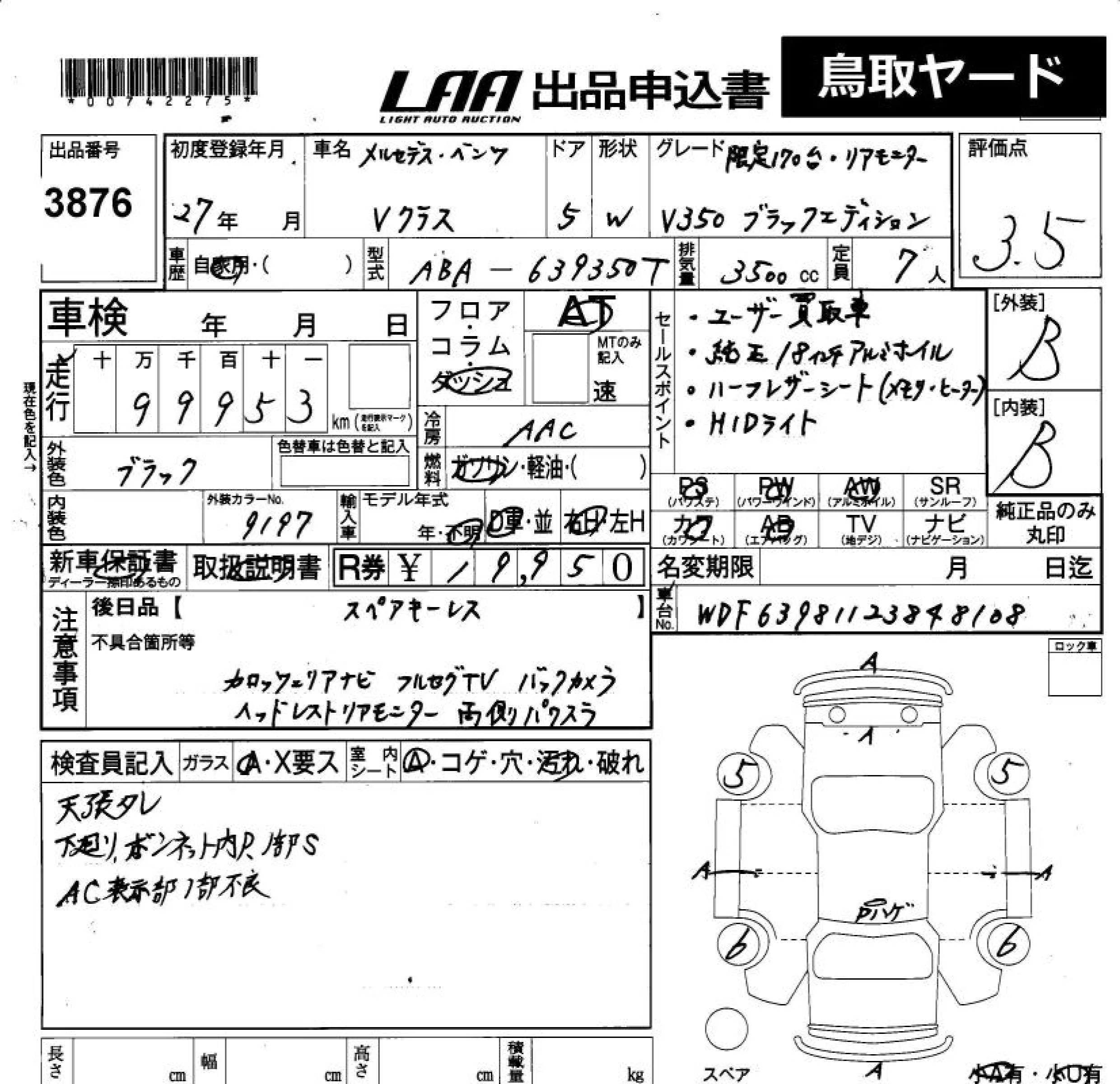 Mercedes-Benz V CLASS с аукциона Японии LAA Okayama лот № 3876