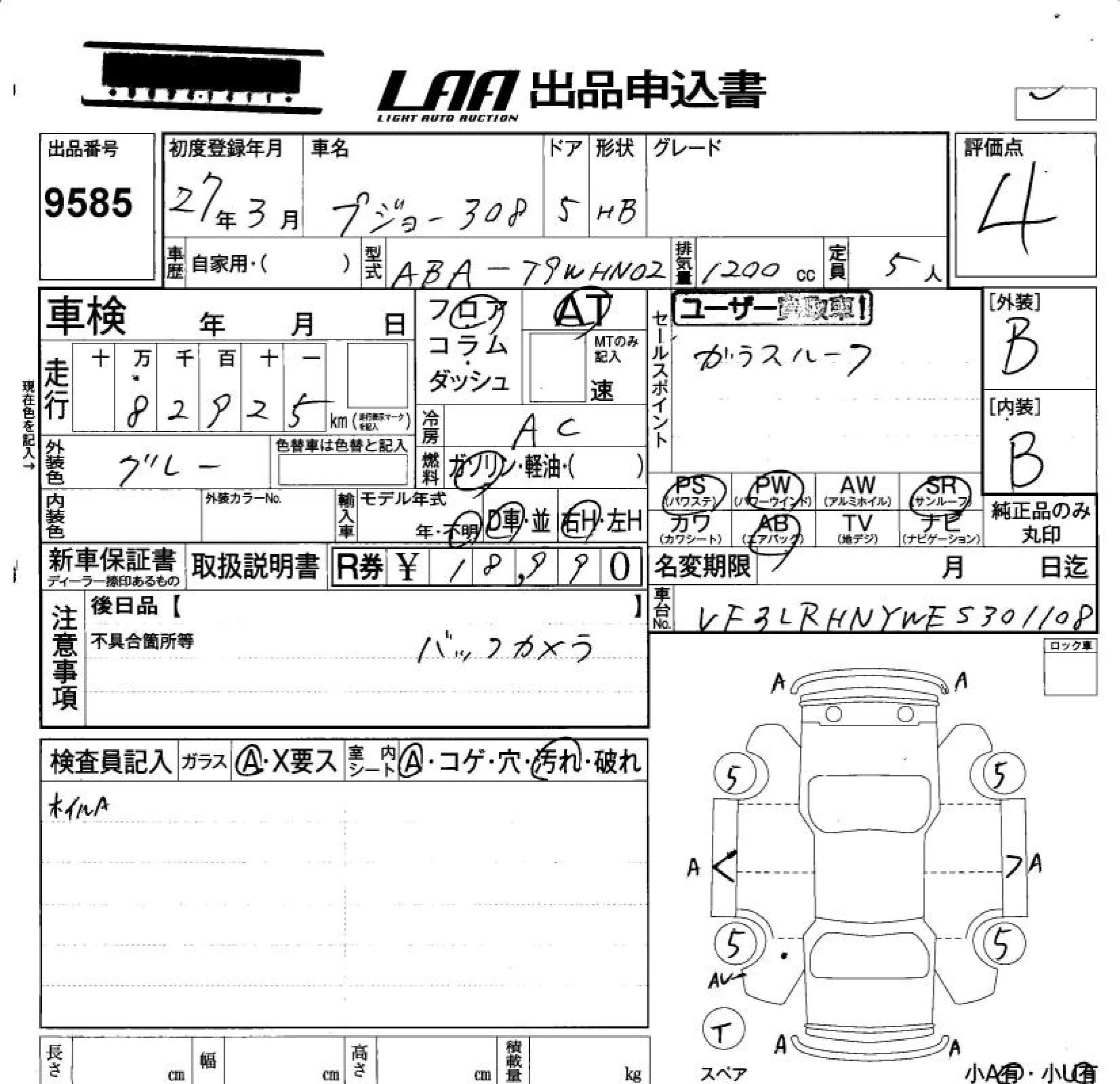 Peugeot 308 с аукциона Японии LAA Okayama лот № 9585