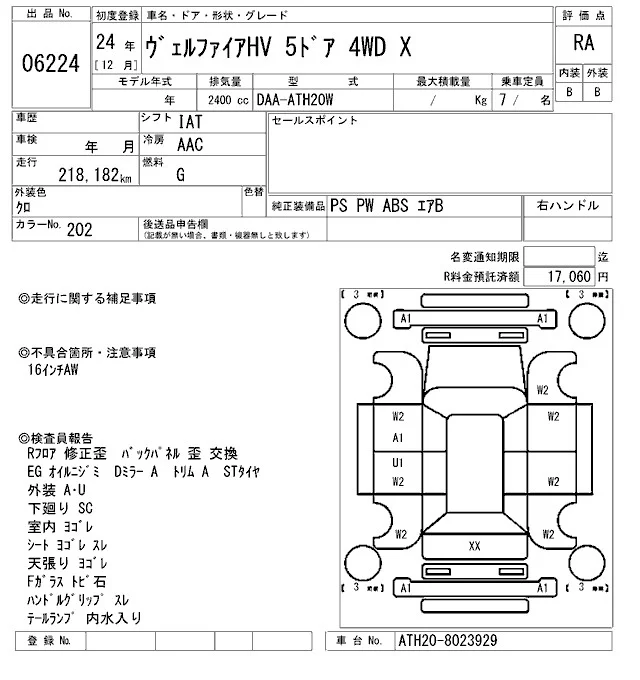 Toyota VELLFIRE с аукциона Японии ARAI Sendai лот № 6224