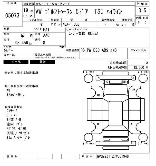 Volkswagen GOLF TOURAN с аукциона Японии ARAI Bayside лот № 5073