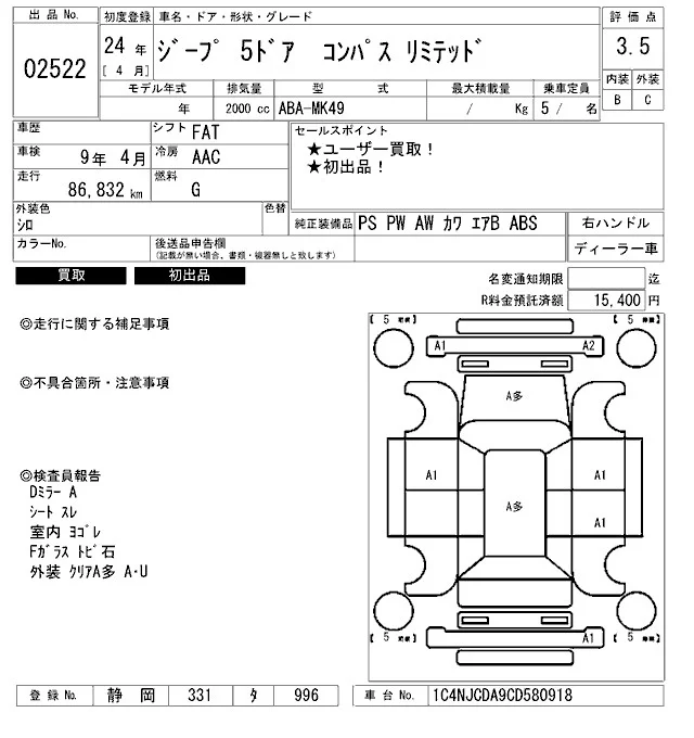 Chrysler JEEP COMPASS с аукциона Японии ARAI Bayside лот № 2522