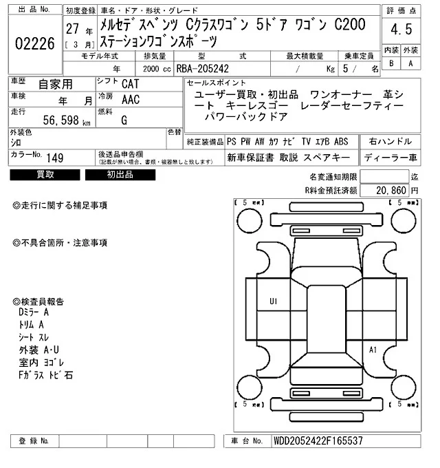 Mercedes-Benz C CLASS WAGON с аукциона Японии ARAI Bayside лот № 2226