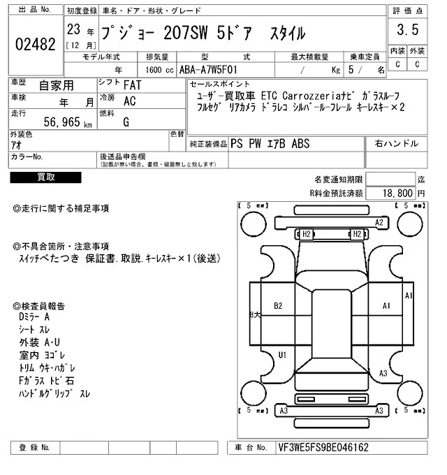 Peugeot 207 с аукциона Японии ARAI Bayside лот № 2482