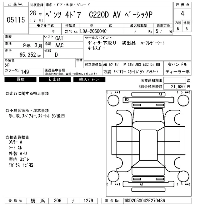 Mercedes-Benz C CLASS с аукциона Японии ARAI Bayside лот № 5115