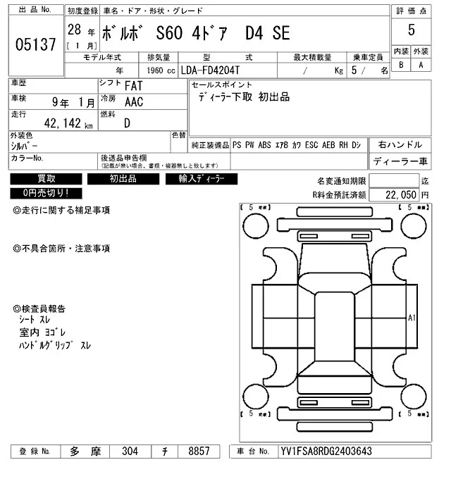Volvo S60 с аукциона Японии ARAI Bayside лот № 5137
