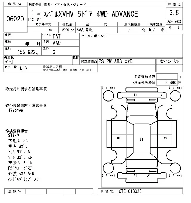 Subaru XV с аукциона Японии ARAI Sendai лот № 6020