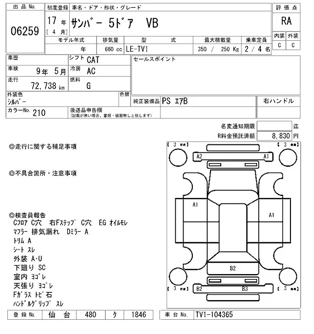 Subaru SAMBAR с аукциона Японии ARAI Sendai лот № 6259
