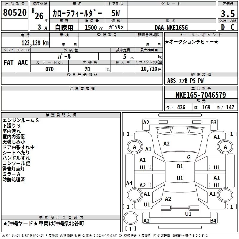 Toyota COROLLA FIELDER с аукциона Японии TAA Yokohama лот № 80520