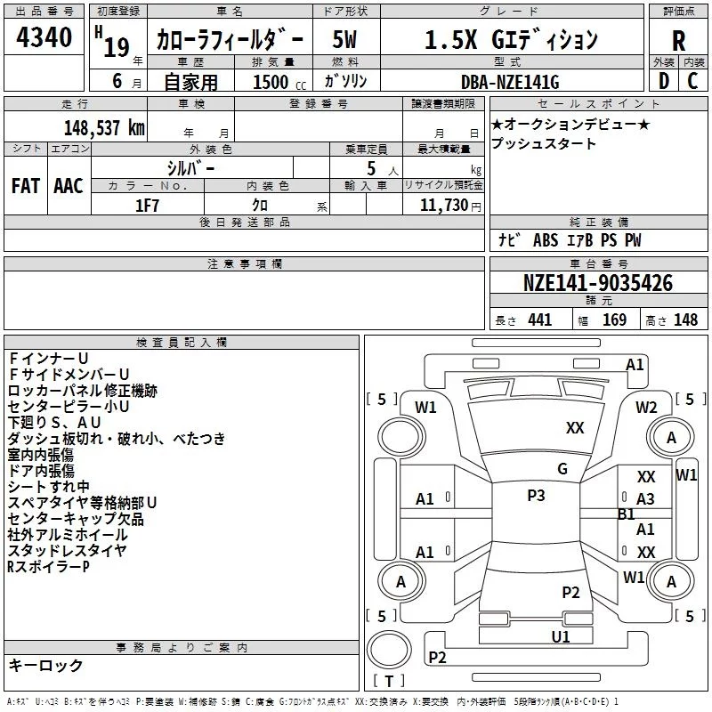 Toyota COROLLA FIELDER с аукциона Японии TAA Yokohama лот № 4340