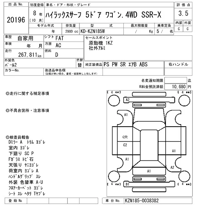 Toyota HILUX SURF с аукциона Японии ARAI Oyama VT лот № 20196