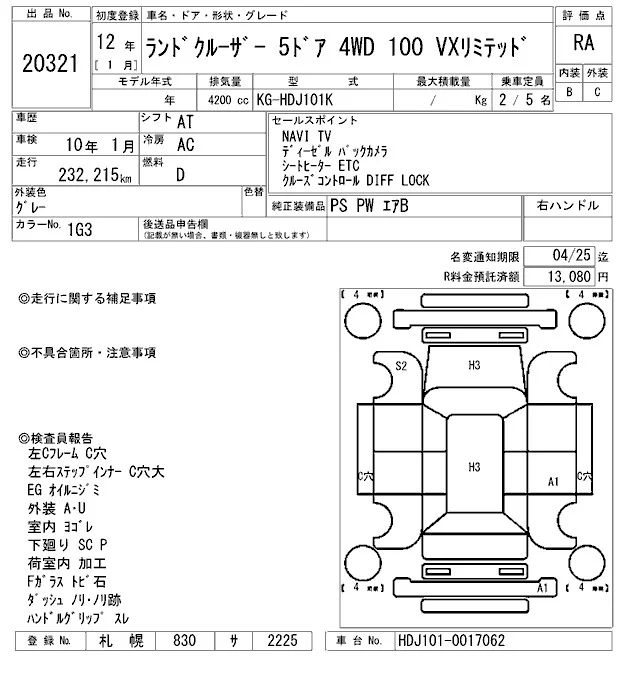 Toyota LAND CRUISER с аукциона Японии ARAI Oyama VT лот № 20321