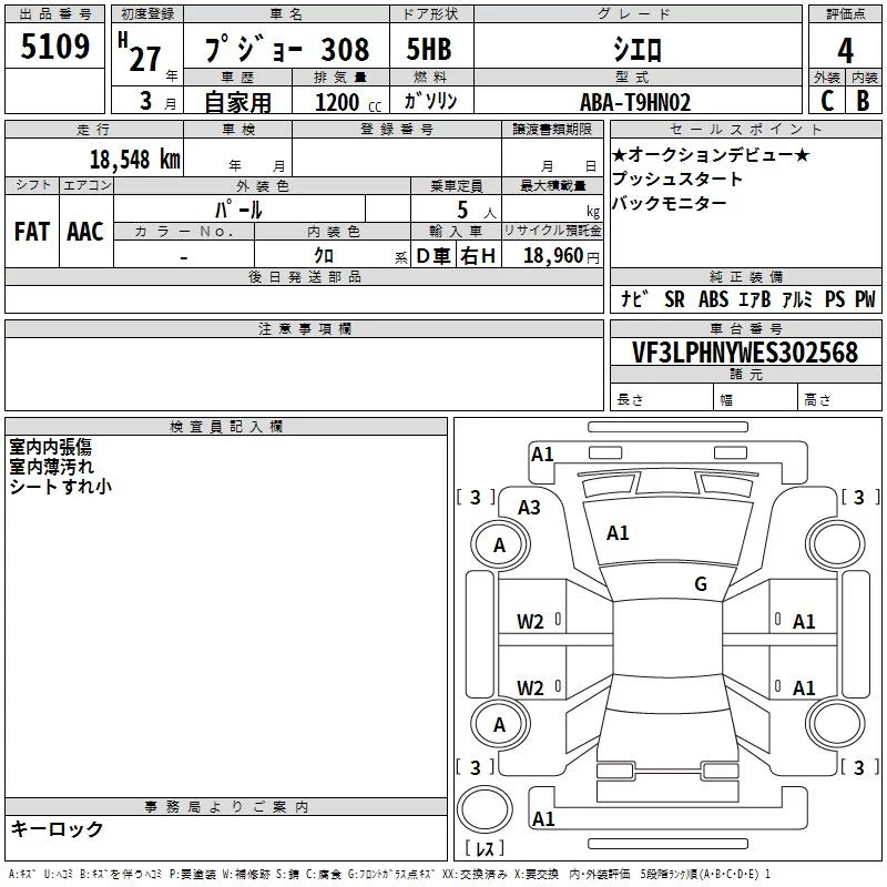 Peugeot 308 с аукциона Японии TAA Yokohama лот № 5109