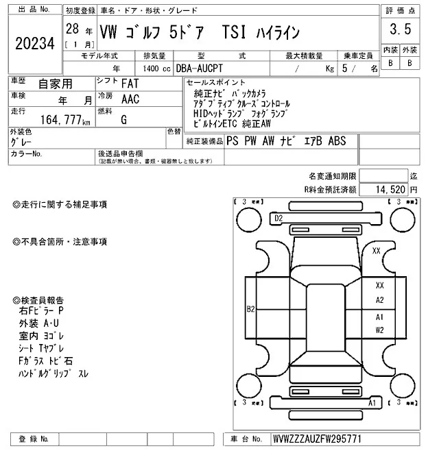 Volkswagen Golf с аукциона Японии ARAI Oyama VT лот № 20234