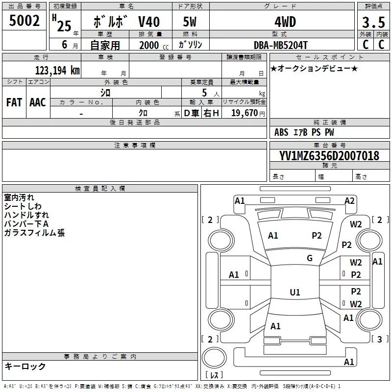 Volvo V40 с аукциона Японии TAA Yokohama лот № 5002