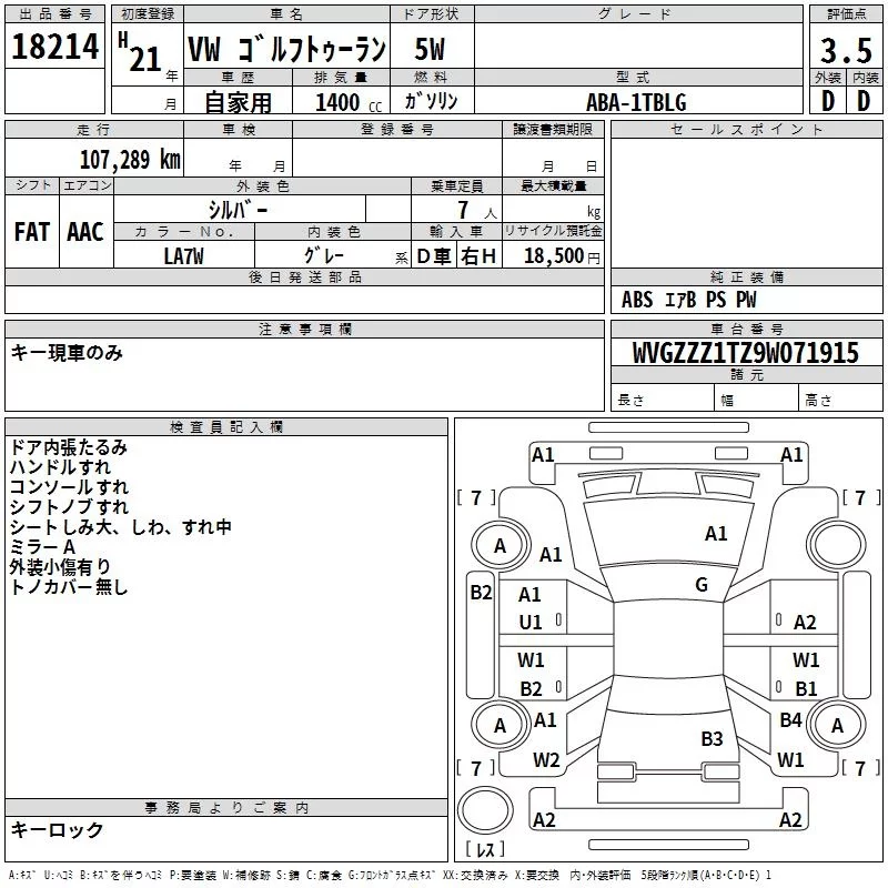 Volkswagen GOLF TOURAN с аукциона Японии TAA Yokohama лот № 18214
