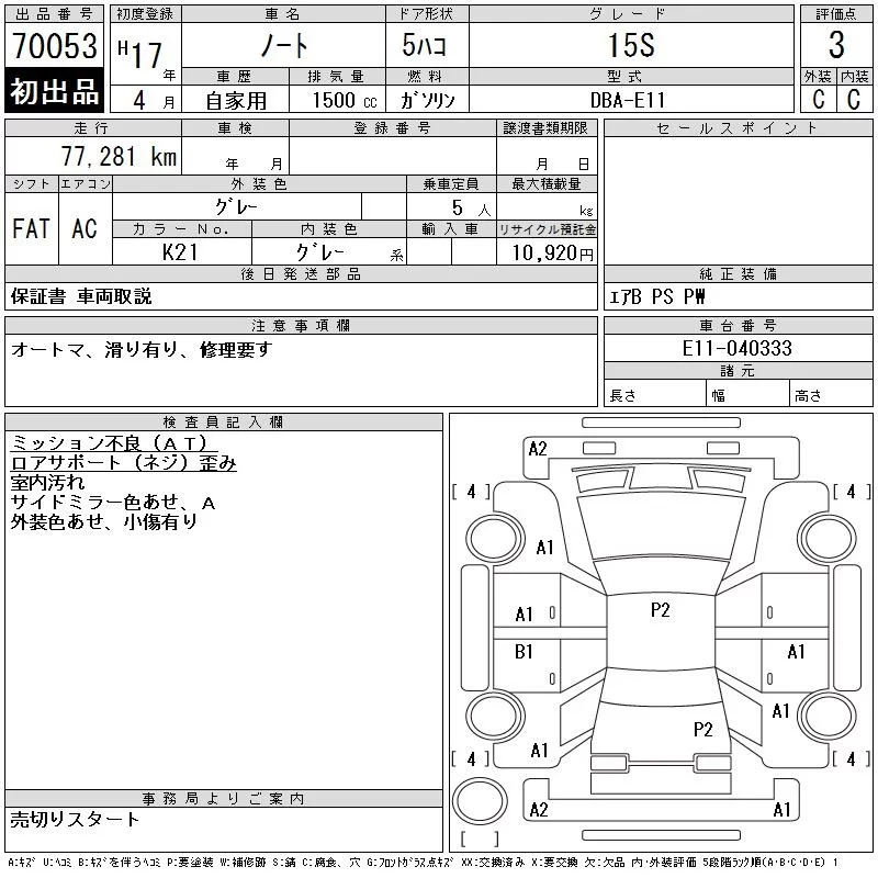 Nissan NOTE с аукциона Японии CAA Gifu лот № 70053