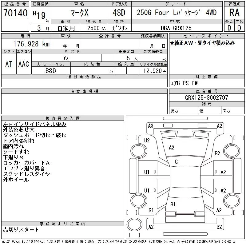 Toyota MARK X с аукциона Японии CAA Gifu лот № 70140