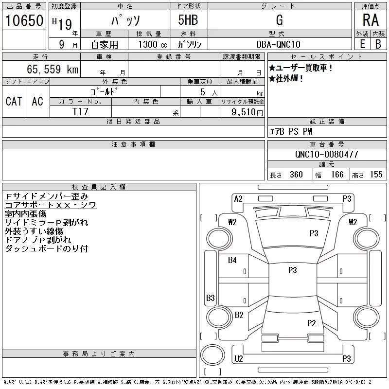Toyota PASSO с аукциона Японии CAA Tokyo лот № 10650